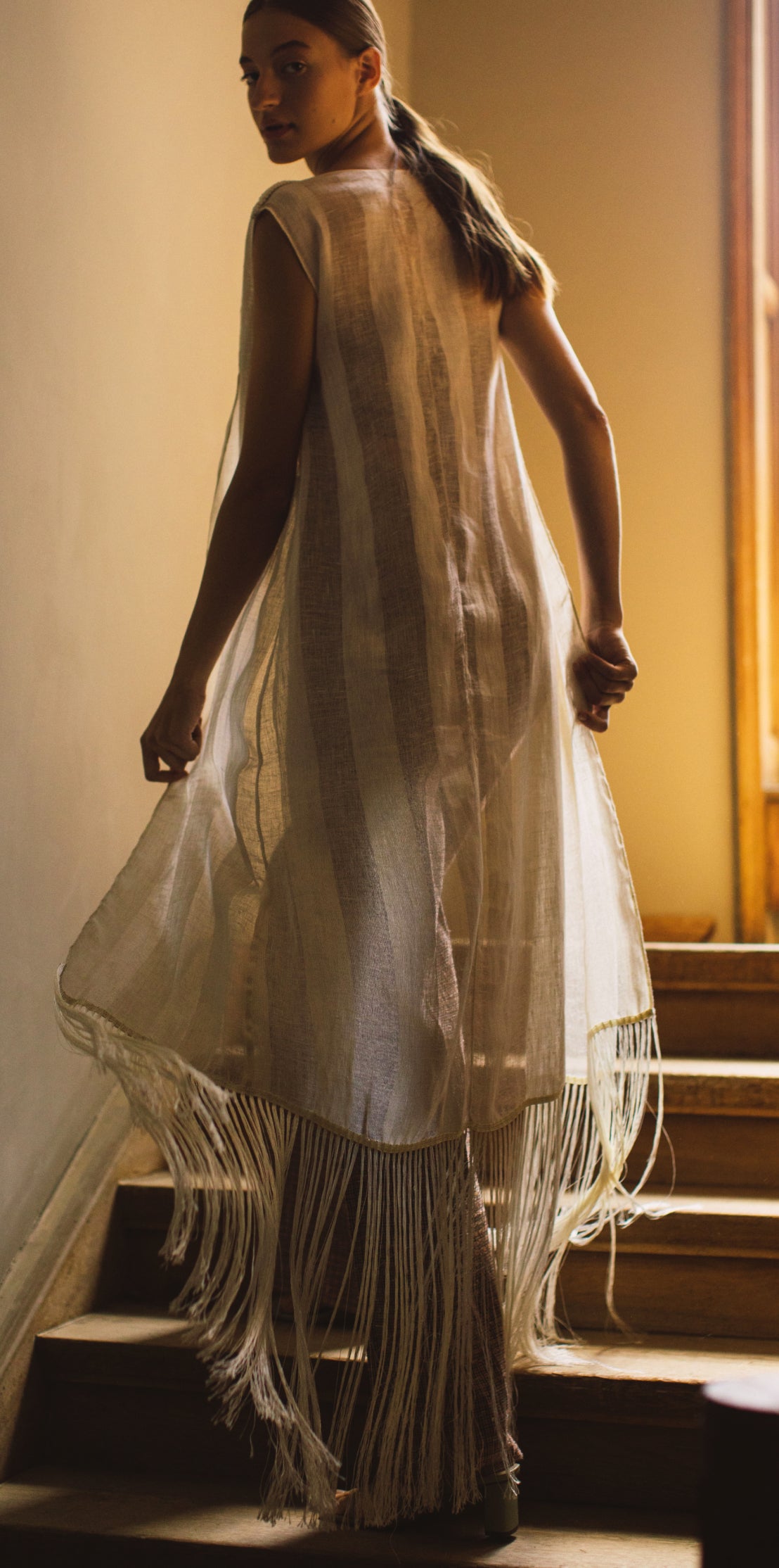 The brands’ signature looks are peg-top silhouette dresses, silk and linen, handcrafted with detailed macramé and other handcrafted artistry.