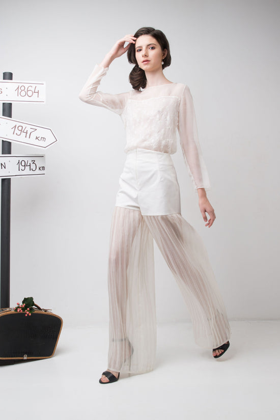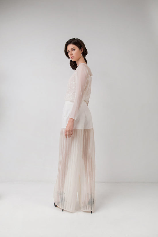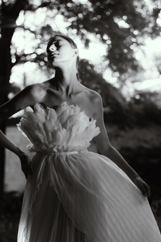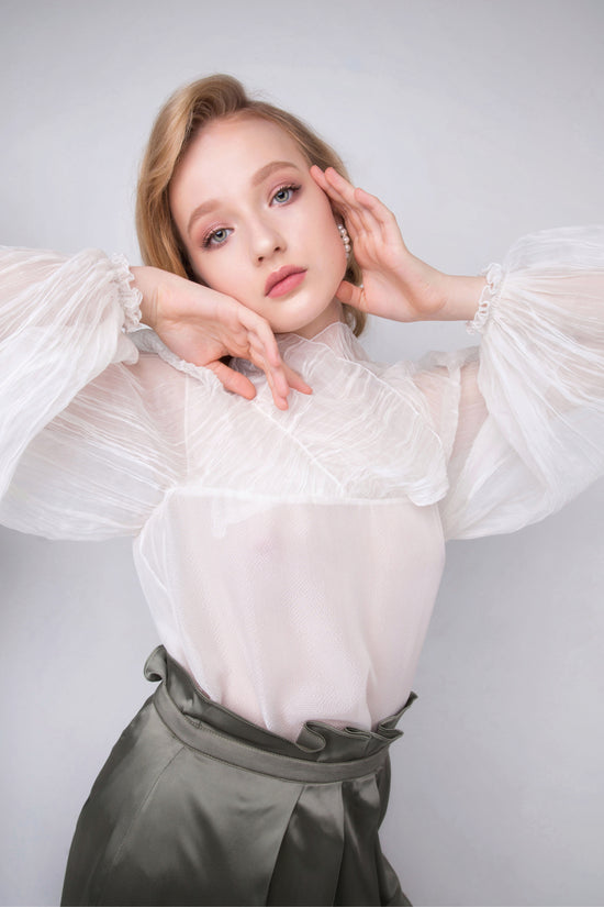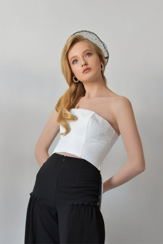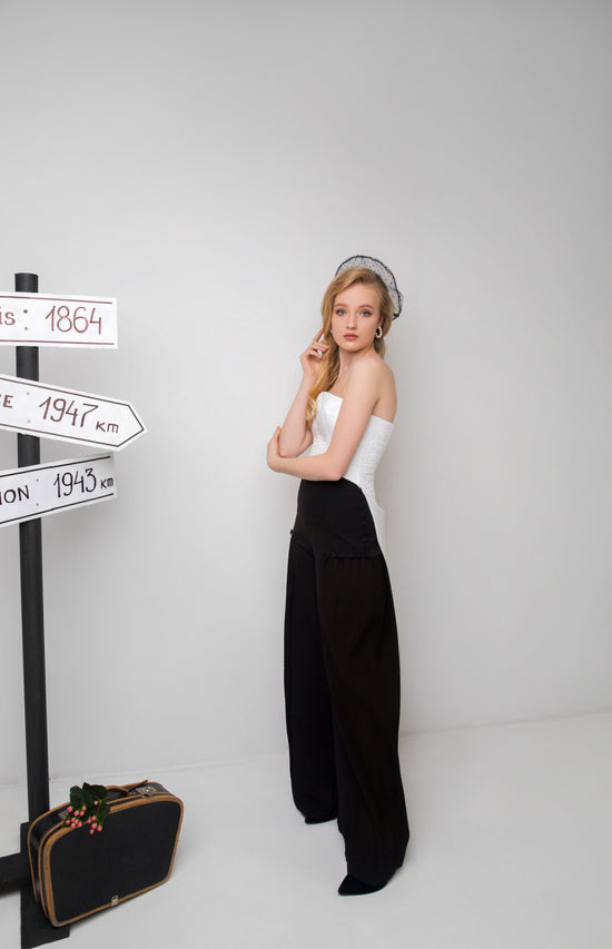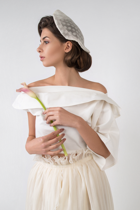Khris K created not only the most delicate dresses but also blouses, tops, palazzo pants, and skirts. Each item relies on exemplary and sophisticated cutting techniques and the quality of the appropriate cloth to achieve minimalist luxury. Draping and pleating make the collection more romantic and delicate. Some looks are decorated with fabric-covered buttons, which are important ornaments and add a unique charm to Daniela Collection. Mesh black and silk beige polka dot berets transmit the feeling of Parisian chic.